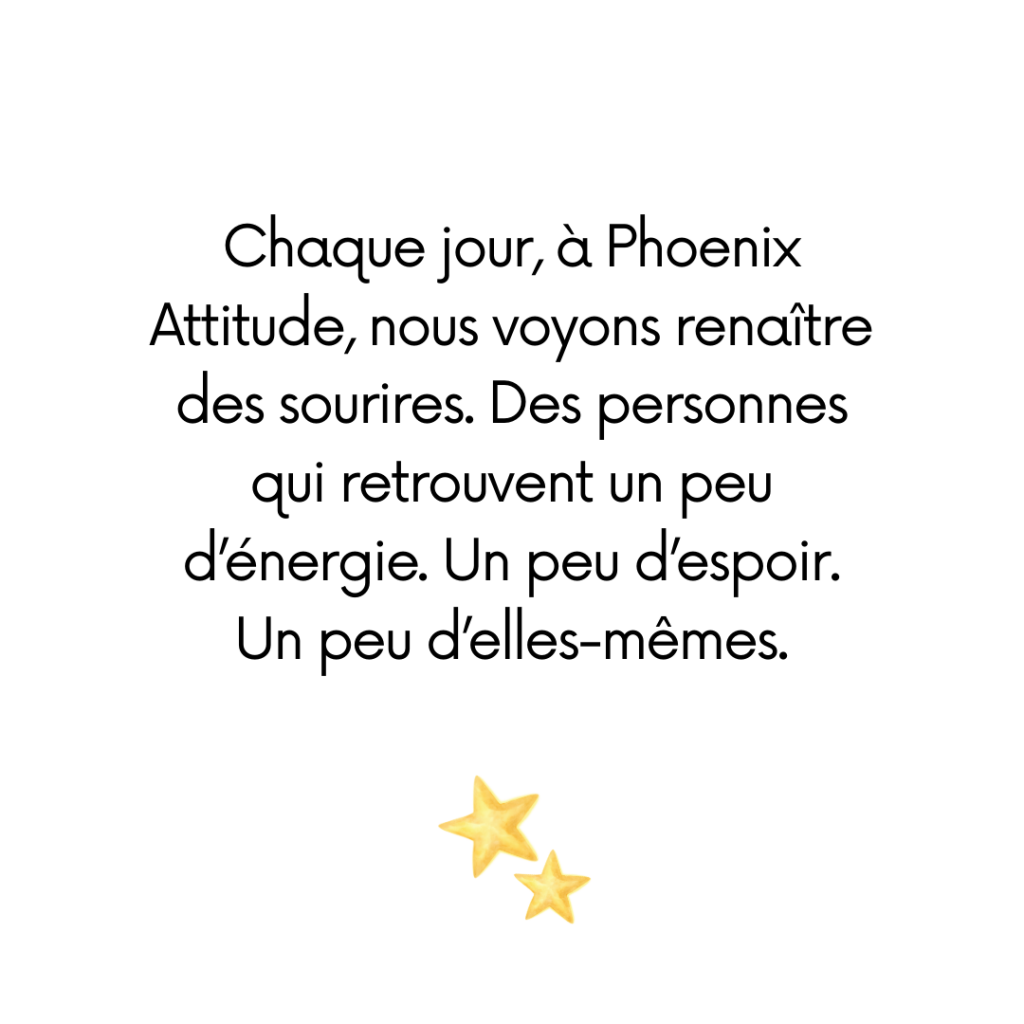 ✨ Chaque jour, à Phoenix Attitude, nous voyons renaître des sourires. Des personnes qui retrouvent un peu d’énergie. Un peu d’espoir. Un peu d’elles-mêmes.