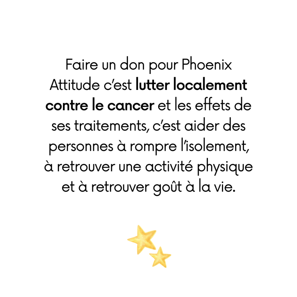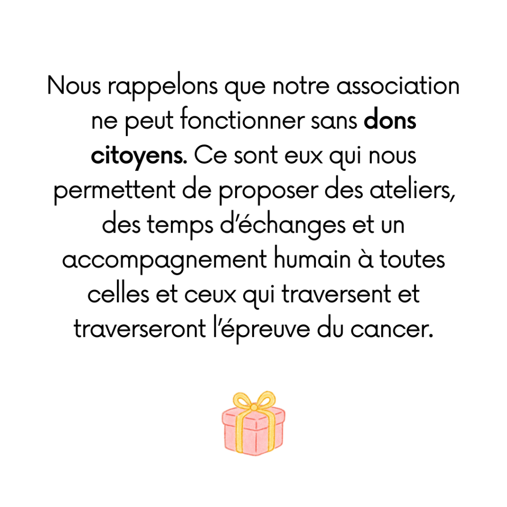 🎁 Faire un don à notre association, c’est prolonger l’existence de notre initiative, et donner la possibilité à des personnes touchées par le cancer (et aux aidants) de bénéficier d’un lieu ressource dans l’épreuve de la maladie.